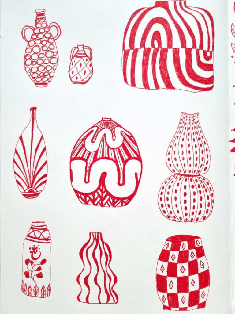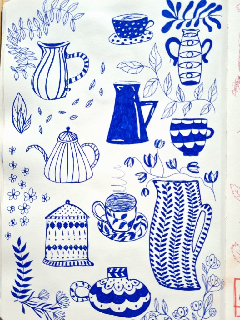 Dziś zabieram Was za kulisy mojego szkicownika — tam, gdzie rodzą się pierwsze pomysły do nowej, kwiatowej kolekcji. To właśnie tutaj, wśród swobodnych linii, filiżanek, wazonów i roślinnych ornamentów, powstaje język, którym później opowiadają moje obrazy.